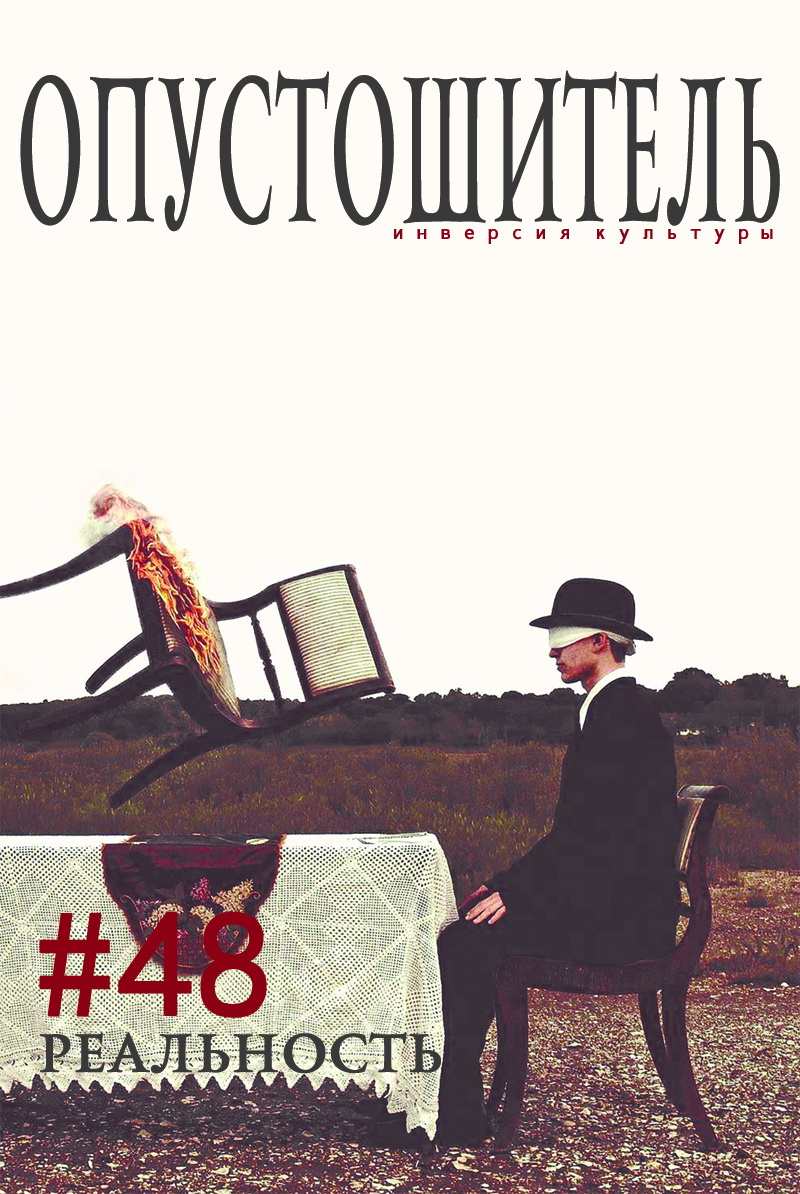 Это и есть сознание человека, готового отказаться от любого своего фрагмента, но лишь до тех пор, пока их можно идентифицировать и они имеют названия. Сердцевина человека — не набор наиболее ценимых им качеств, а то, что он не осознает, лишь смутно подозревает об его существовании, не в силах сказать что-то более-менее внятное. Этот странный напиток, который никто не пробовал, включая самого человека, и есть главная его часть, без которой он невозможен. Как невозможна реальность без таких авторов, как Эмиль Мишель Чоран, Луи Арагон, Вадим Климов, Раймон Руссель, Шарль Моррас, Николай Старообрядцев, Мишель Лейрис и тому подобные. Снова апрель, а значит, и снова Опустошитель. #48! Реальность…